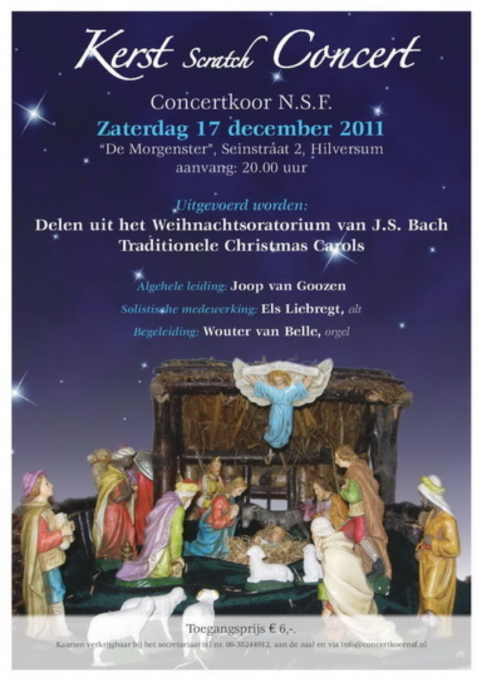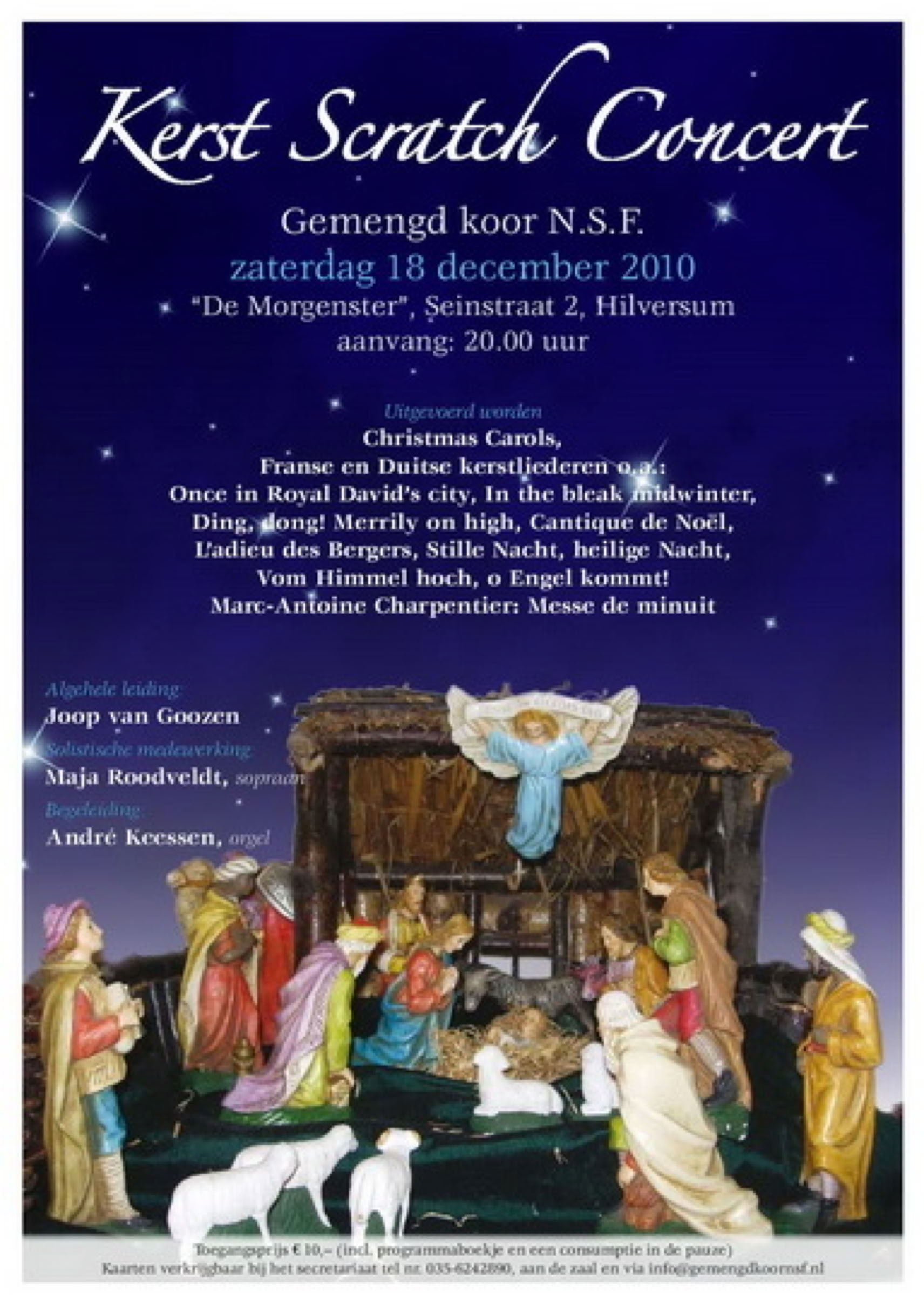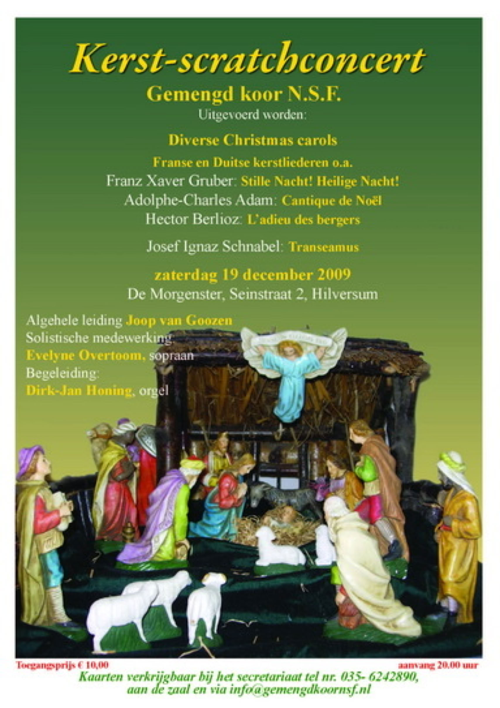 Op 22 december 2007 organiseerden wij een KERST Scratch-concert in samenwerking met Musica instrumentalis en Cees van der Poel onder algehele leiding van Joop van Goozen. Met ruim negentig scratch zangers uit Hilversum en (verdere) omstreken heeft dit een muzikale dag opgeleverd, waar met veel plezier gezongen is. Deze dag eindigde met een concert in een uitverkochte zaal. Helaas was Mylou Mazali ziek. Op het laatste moment had zij echter voor ons de alt soliste Annette Stallinga geregeld die samen met de sopraan soliste Renée Harp aan het concert een prachtige bijdrage leverde.